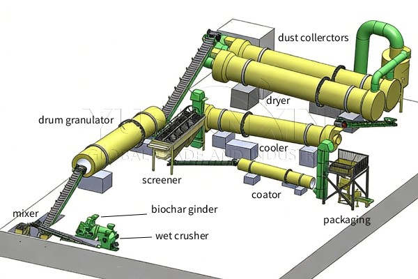 In addition, the biochar compost granules making system adopts multiple steps to process biochar and compost. Including biochar crusher, compost grinder, double shaft blender, rotary drum granulation machine, pellets screener, rotary dryer and cooler, single bucket bagging equipment and conveyors. They can produce granular char-based fertilizer with 5-6 TPH output, round shape and adjustable size of 3-6 mm. Additionally, the biochar fertilizer granulation project costs only 126,860USD.